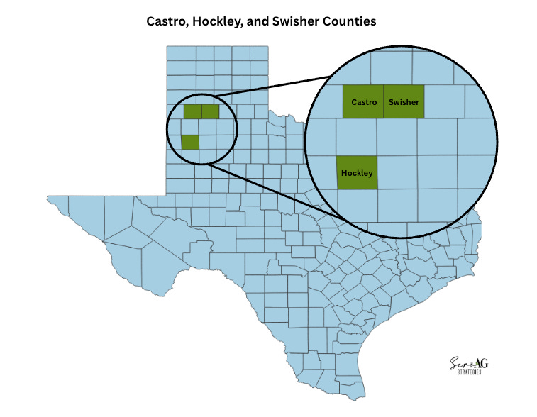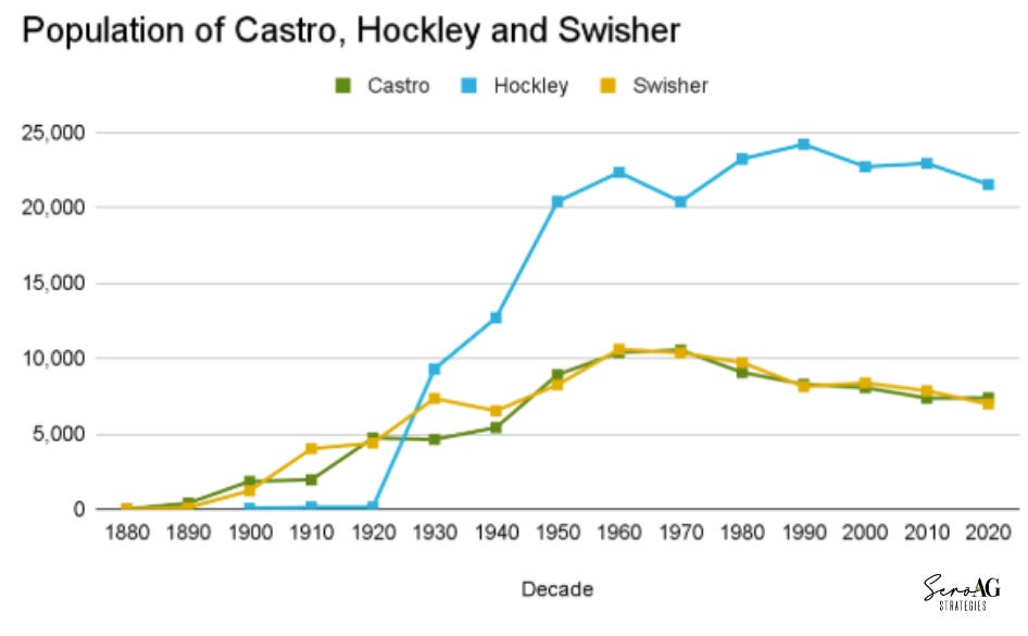 The best way to explain this is through an example from the Texas High Plains. While CRP enrollment affects population decline, it’s not the only factor. We’ve analyzed three counties: Castro, Hockley, and Swisher. On the surface, these counties look pretty similar. They are all blessed with (or suffer from, your choice) a semi-arid climate and rely heavily on groundwater from the Ogallala. They all depend on large-scale row crop farming. They largely grow the same crops, like cotton and sorghum. Each county’s population is rural, with low population density, and they’re all seeing some level of population decline from the mid-20th century, with aging populations to boot. There are also some big differences. First of all is scale. Castro has a population of 7,371; Hockley 21,537; and Swisher 6,971. Castro County has a diversified agricultural presence, with large commercial feed yards and a number of dairies. Hockley County is home to a community college, providing a source of non-ag employment that draws people to the area and provides stability outside the farm. Swisher County includes a state prison, providing state-funded jobs, but likely not attracting people to the point of population growth. Let’s take a look at how all of these factors affect population decline in these counties.