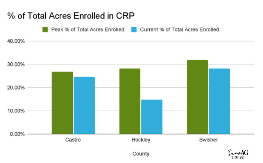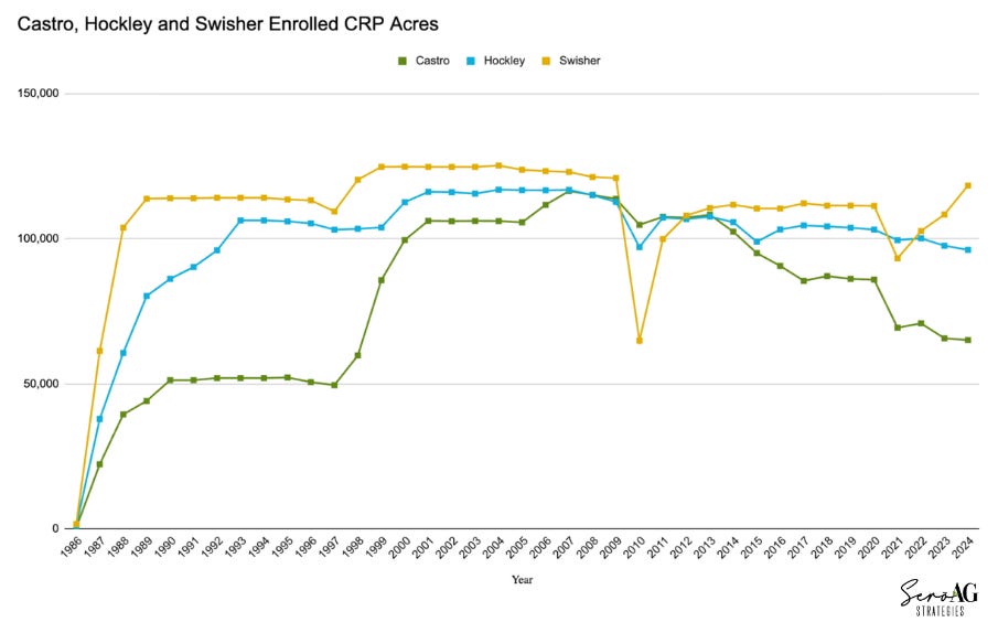 CRP enrollment in Swisher, Castro, and Hockley was not a one-time phenomenon following the program’s launch in the late 1980s. In each county, enrollment peaked around the mid-2000s. This signaled an expanding role for land retirement from CRP’s start in the mid 1980s to that time, rather than a temporary response to initial incentives. At that peak, between 27% and 32% of total cropland was enrolled in CRP. In Swisher, nearly one-third of cropland moved out of production, and even today, more than 28% remains enrolled, which is only about 6% below its peak. This tells us that CRP has become a near-permanent feature of the county’s land base. Castro experienced a sharper reduction, with CRP acreage falling more than 40% from its 2007 high, while Hockley sits between the two, with a moderate decline but still a meaningful enrollment footprint. The key distinction is not just magnitude, but persistence. When one-quarter to one-third of a county’s productive base transitions out of active production for decades, the consequences extend well beyond conservation metrics, influencing local throughput, infrastructure viability, and the broader economic fabric that depends on sustained agricultural activity.